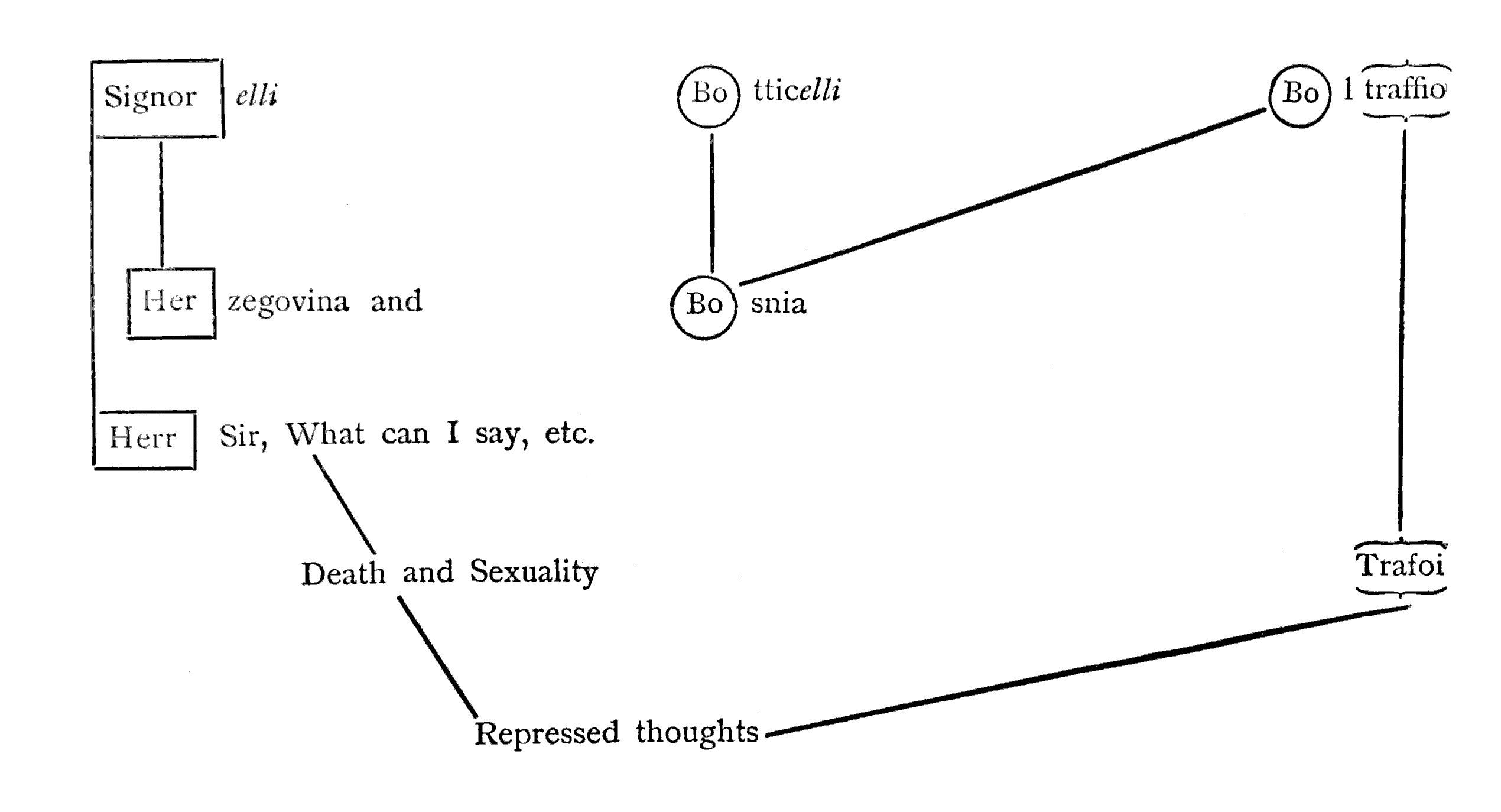 (e) The nature of the association formed between the lost name and the repressed theme (death and sexuality, etc.), containing the names of Bosnia, Herzegovina, and Trafoi, is also very strange. In the scheme inserted here, which originally appeared in 1898, an attempt is made to graphically represent these associations.